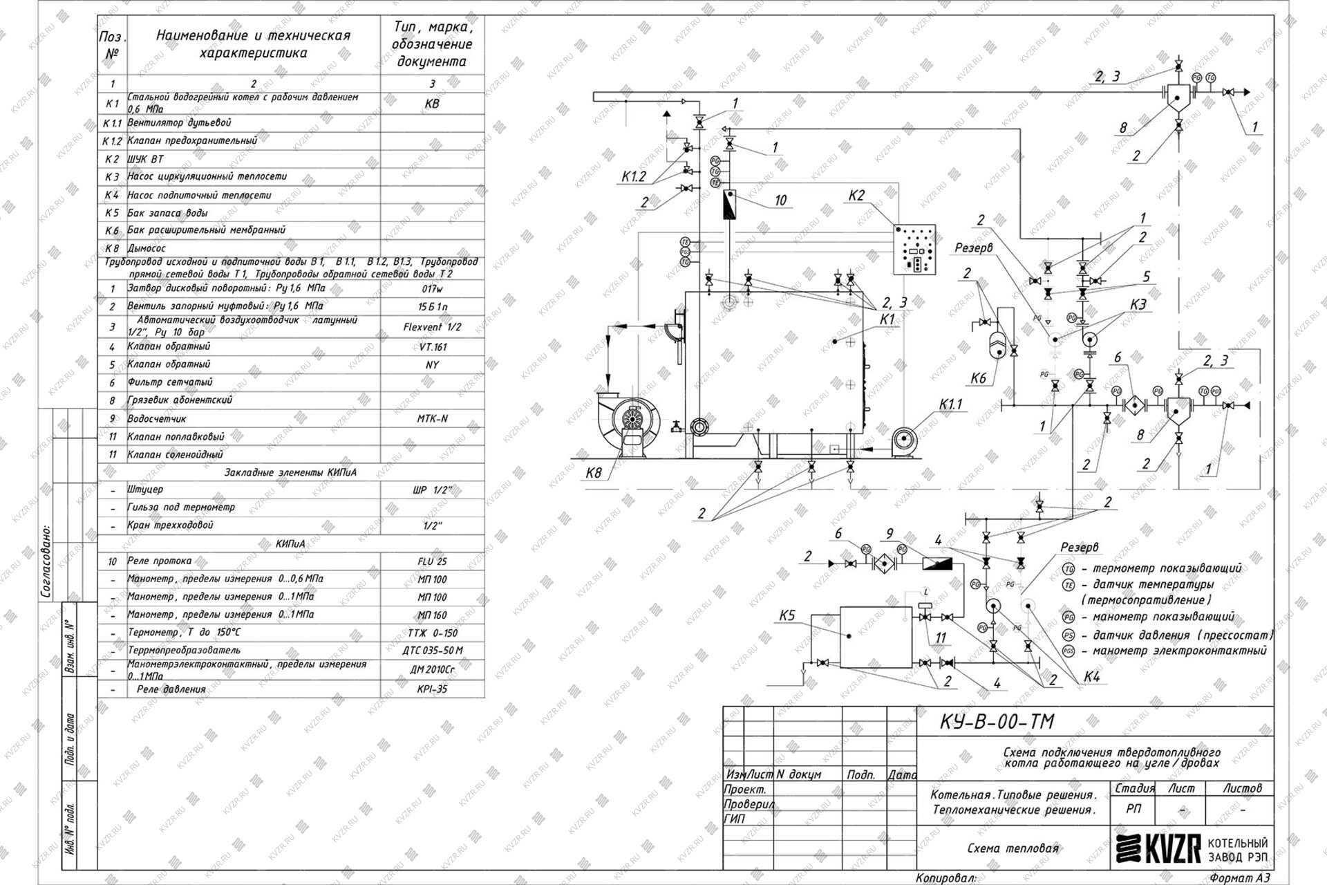 Образец тепловой схемы подключения котла 0.47 МВт уголь дрова и вспомогательного оборудования в котельной приведен на данной схеме. При эксплуатации очень важно грамотно осуществить подключение оборудования, установить все контрольно измерительные приборы, для контроля параметров работы котельной и запорную арматуру для оперативного переключения потока теплоносителя при плановой или аварийной остановке оборудования. Данную схему можно использовать как пример для разработки под свой объект или заказать у нас разработку индивидуальной схемы для вашей котельной.
