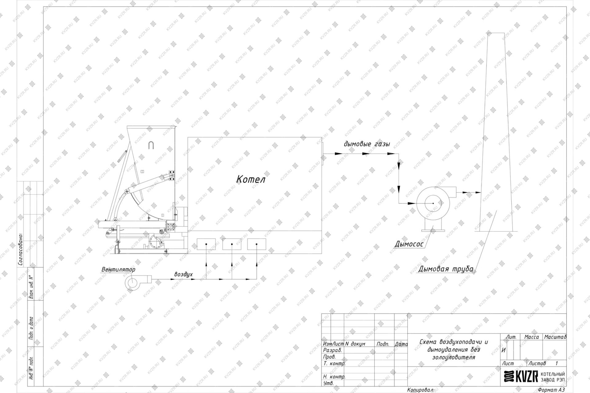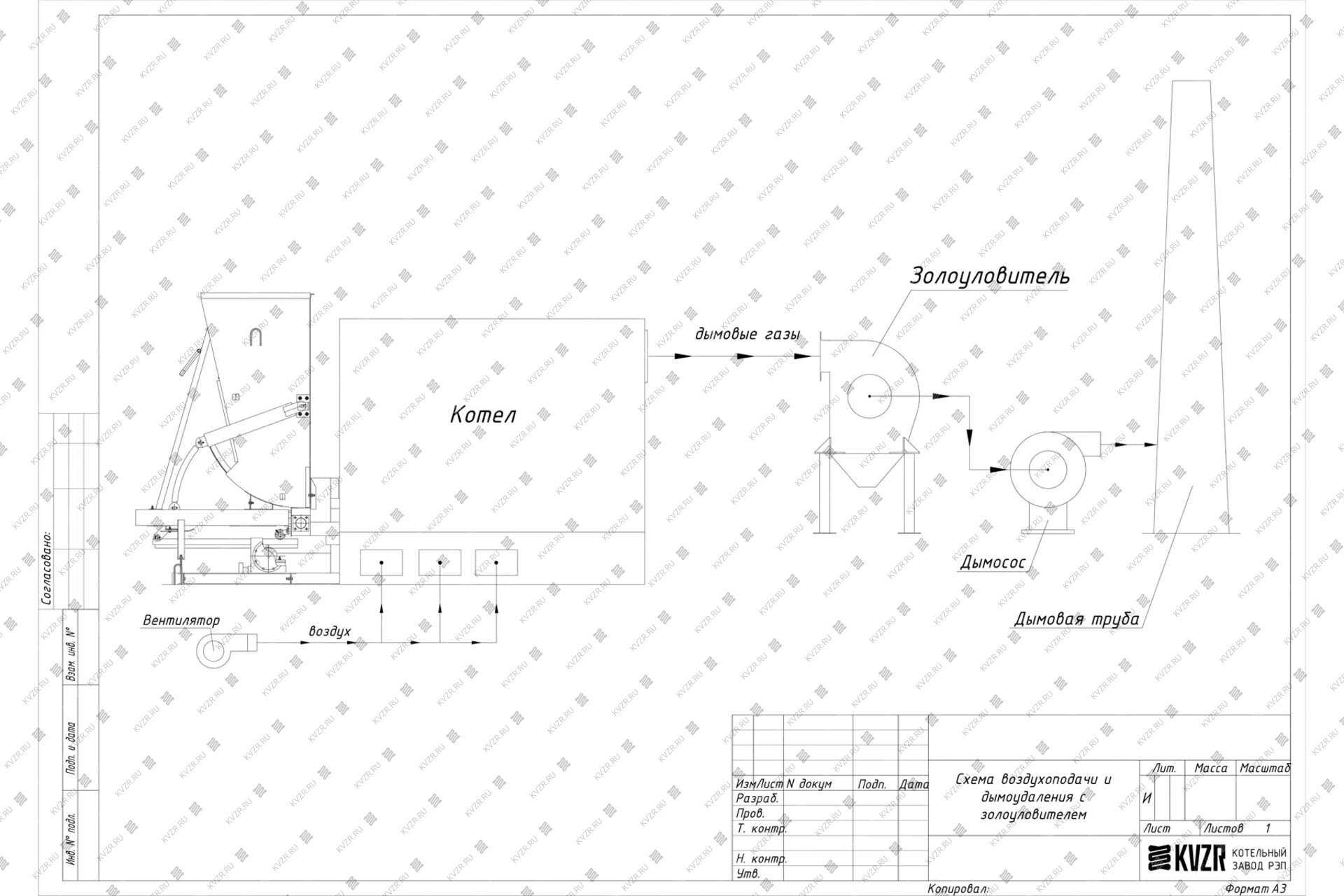 В случае, если степень очистки дымовых газов высокая не требуется, можно установить котел КВм-1.5 с ТШПМ без золоуловителя. Схема подключения при этом следующая - дымовые газы выходят из котла в газоходы котельной, затем в дымосос и далее снова по газоходам в дымовую трубу. В зависимости от компоновки котельной дымосос может устанавливаться как в котельной, так и на улице. Наш завод производит газоходы и переходники к ним. Получив схему вашей котельной мы можем изготовить для вас комплект газоходов, переходников нужных размеров и сечений. На месте такие детали собираются как конструктор. Обращаем ваше внимание, что газоходы требуют изоляции, для защиты персонала от ожогов, так как уходящие газы имеют высокую температуру, а на улице газоходы требуют изоляции для избежания образования конденсата.